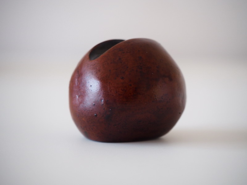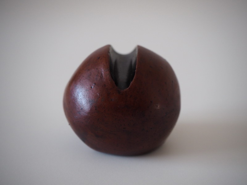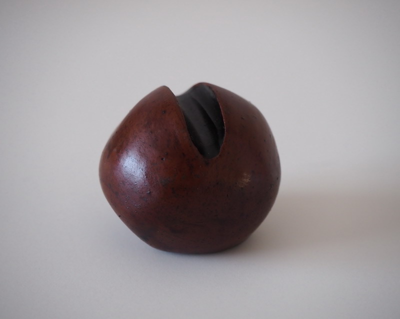 Il corpo è sferico e leggermente asimmetrico, bruno, compatto; la superficie trattiene micro-tracce, piccole discontinuità e puntinature che non considero difetti da cancellare, ma segni del tempo della materia. In alto, un taglio netto interrompe il volume: è una ferita controllata, una soglia. Da lì si intravede l’interno scuro, come se il pieno proteggesse un vuoto e lo concedesse solo in minima parte.