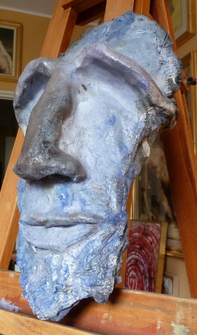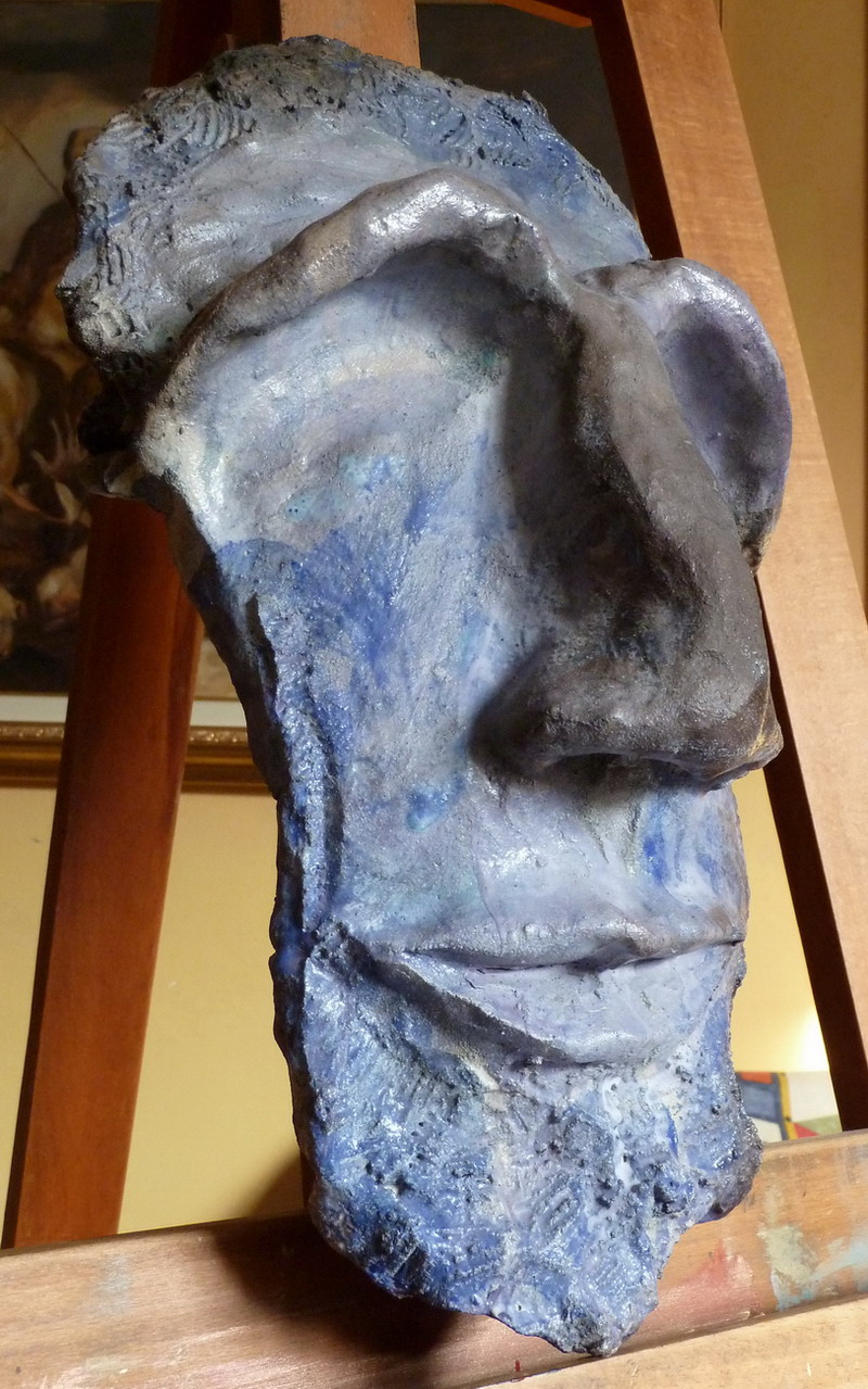In questa maschera in argilla, nata attraverso la tecnica raku, il volto si affaccia dal silenzio della materia come se stesse ricordando un’origine lontana. Le superfici irregolari, segnate da blu e grigi cangianti, non cercano perfezione ma autenticità, quella stessa che la cottura raku restituisce attraverso imprevedibili tracce di fumo e metallo. È un volto che non impone espressioni: invita piuttosto a leggerne le risonanze interiori, le pieghe sottili in cui si accumulano memoria, fatica, stupore.