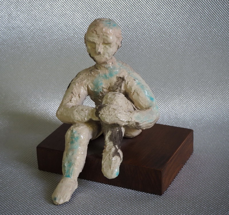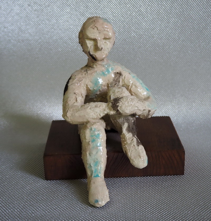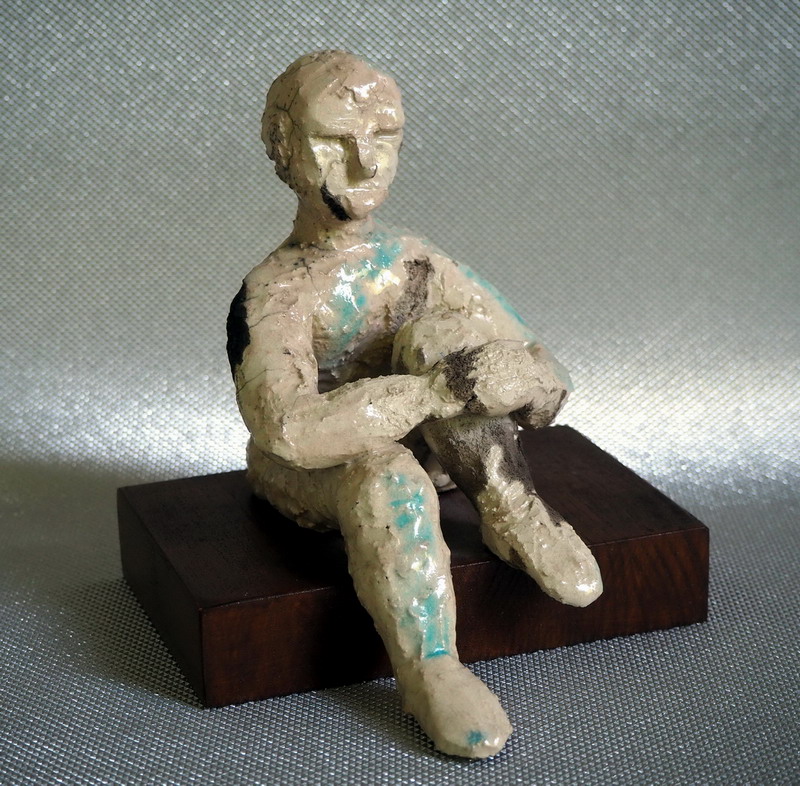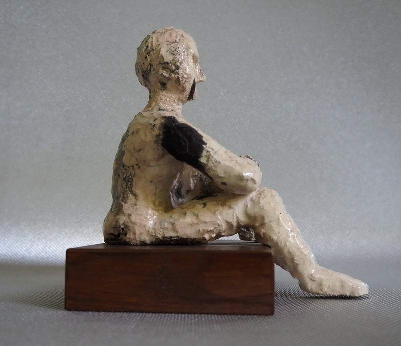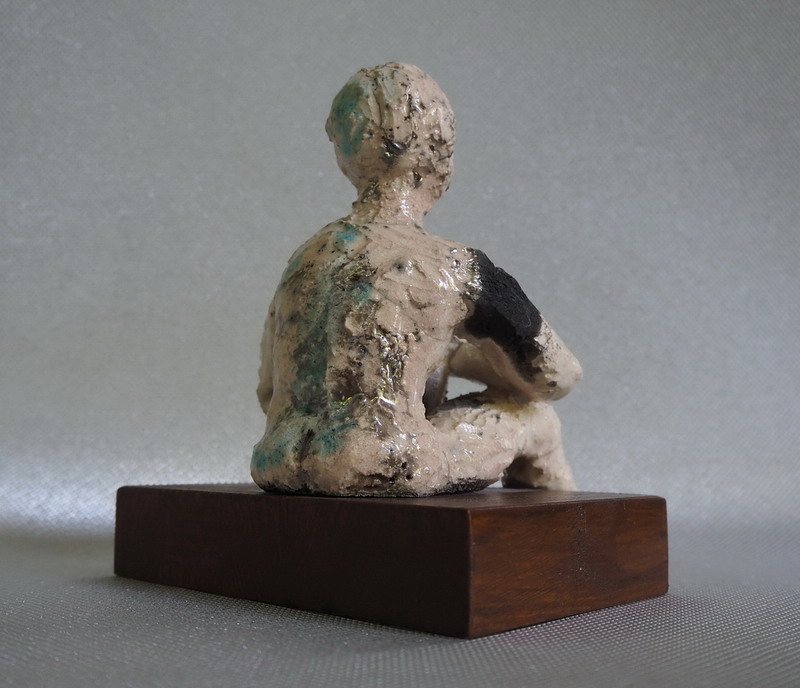 Questa scultura in argilla, realizzata con la tecnica raku, rappresenta una figura umana seduta in una posa contemplativa.