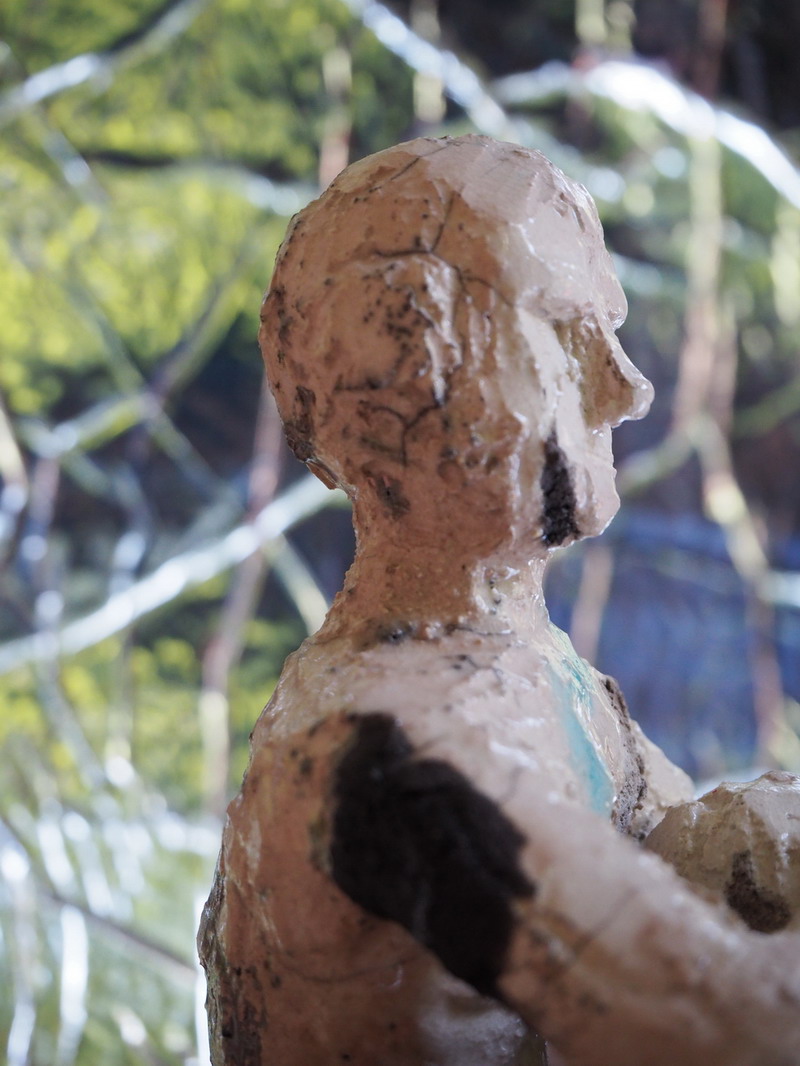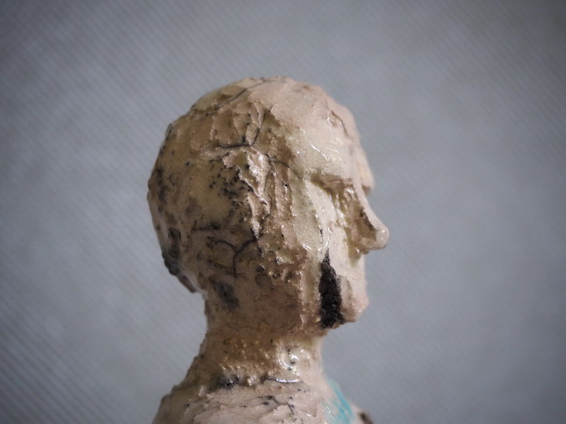 La scelta del raku, con la sua imprevedibilità e la sua texture unica, riflette perfettamente il carattere autentico e imperfetto della condizione umana. Il contrasto tra le superfici grezze e gli accenti blu aggiunge profondità, richiamando la fragilità e la bellezza della vita. La base in legno, essenziale e naturale, sostiene la figura e richiama il legame con la terra.