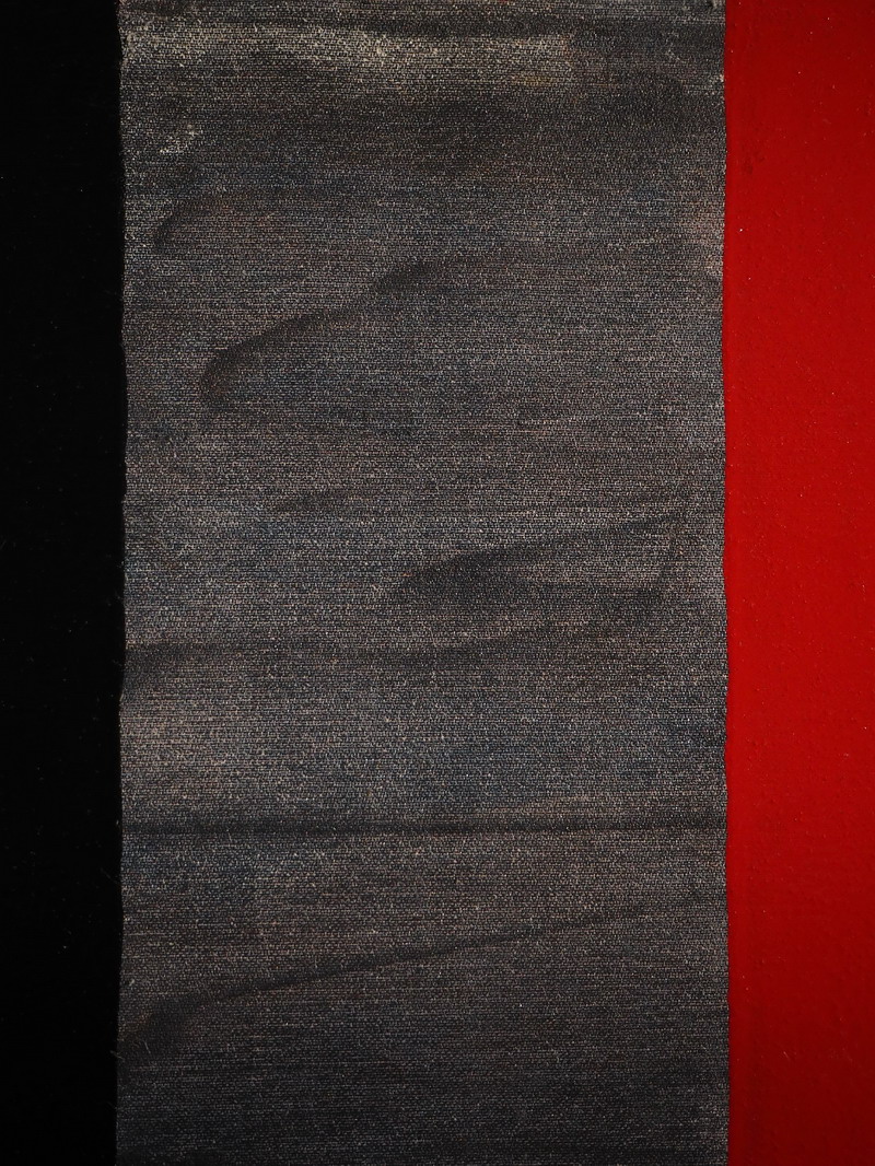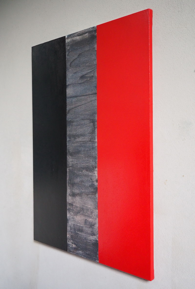 Tre campiture verticali — nero, grigio materico, rosso — organizzano la tela come un respiro a tre tempi. Il nero trattiene, il rosso afferma, il grigio centrale è la “sutura” che fa dialogare gli opposti: non un margine neutro, ma la traccia di una riparazione interiore. L’uso degli smalti rende ogni gesto definitivo e senza ripensamenti, trasformando la decisione dell’artista in superficie vibrante. In questa tensione controllata la ferita diventa forma: una dichiarazione di unicità che richiama la logica del Kintsugi (evidenziare la cicatrice come valore), intrecciata all’estetica wabi-sabi che accoglie impermanenza e dissonanza come sorgenti di bellezza. L’opera invita a sostare fra i poli, nel punto in cui la frattura si fa ponte, convertendo il limite in significato.