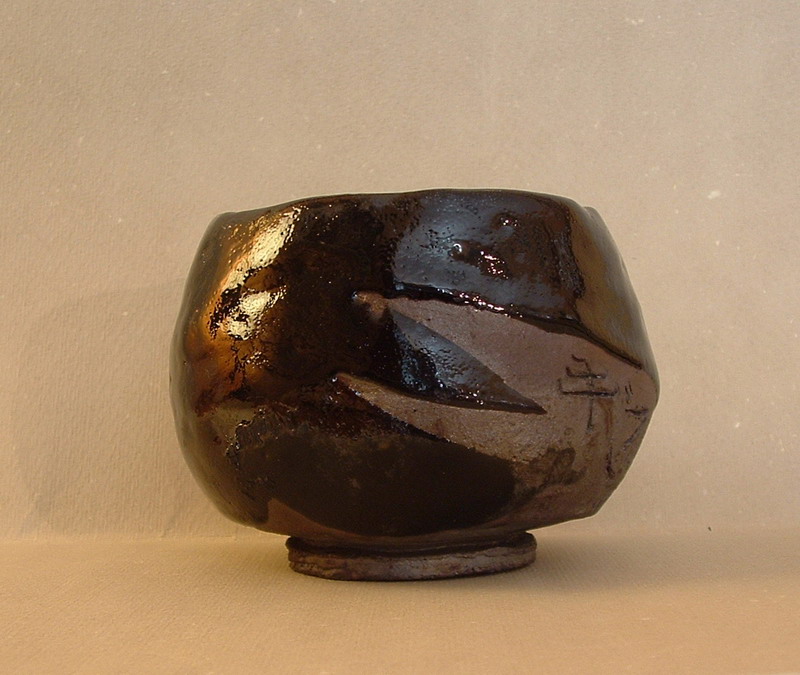 La cottura raku ha inciso la sua firma: zone lucide, cavità minute, contrasti bruni che ricordano i chawan Ōguro, le tazze nere dai toni profondi tipiche delle antiche cerimonie del tè. L’incisione sul fronte è una mia traccia.